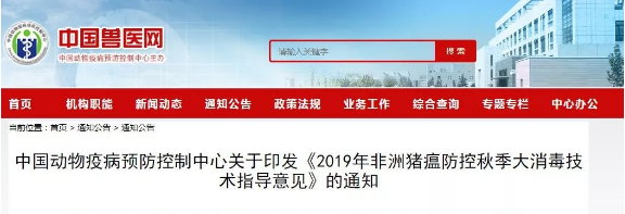 2019年10月22日,中國動物疫病預(yù)防控制中心為做好全國秋季“大清洗、大消毒”專項(xiàng)行動,起草了《2019年非洲豬瘟防控秋季大消毒技術(shù)指導(dǎo)意見》,指導(dǎo)養(yǎng)殖企業(yè)的秋季消毒工作。